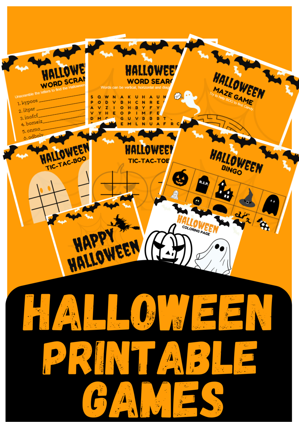Printable Happy Halloween Games Bundle, Halloween poster/Card, Word Scramble game, Word Search game, Maze game, halloween Tic-Tac-Boo and Tic-Tac-Toe Game, Halloween Bingo Game, Coloring Page