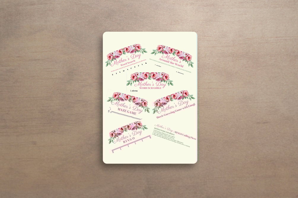 Mother's Day Printables Games Multipack,Word Search, Mother’s Around the world, Word Scramble,Maze game, Movie guessing game with emoji,Bingo game and Foldable GREETING CARD to write your handwritten message and Thank you card.